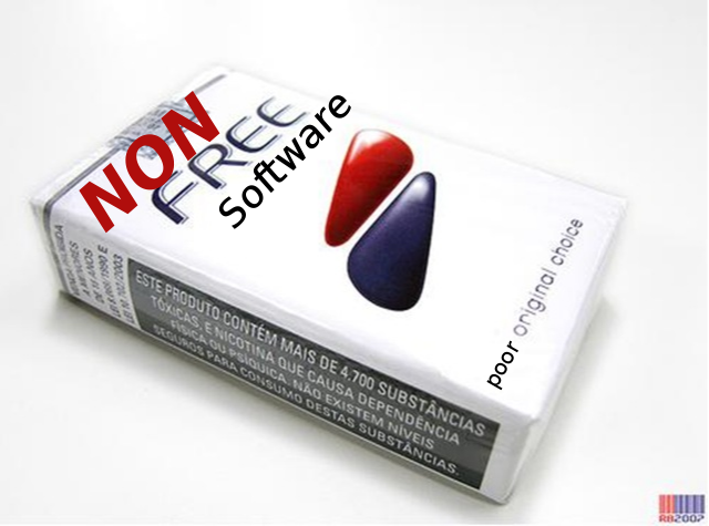 First presented on Friday, April 18, 2008, the anti-non-Free Software speech compares the harmful social and individual effects of tobacco (tabaco) and tobraco (trabaco). One of them is well known for causing dependency and impotence, having a powerful and unscrupulous industry promoting products while perfectly aware of the harmful consequences they bring to their customers; in fact, these businesses take advantage of the dependency and even enhance it to increase their gains. The other is just a plant from whose leaves cigarettes et al are made.
